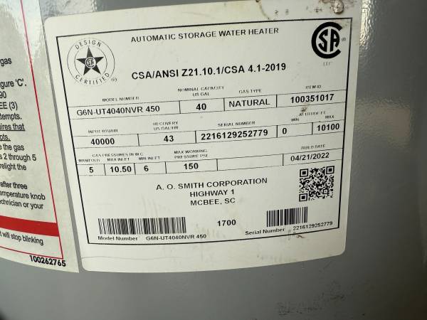 A.O. Smith Water heater - Used indoors - 40 Gal. Part #G6N-UT4040NVR 450 S/N: 2216129252779 Build Date: 04/1/2022