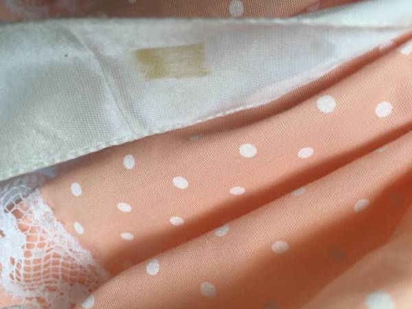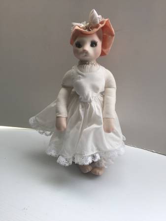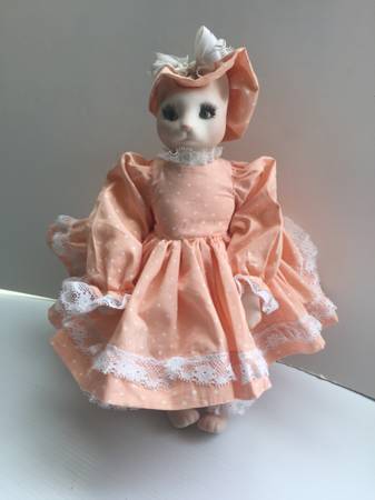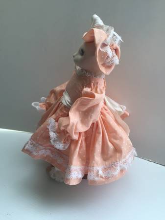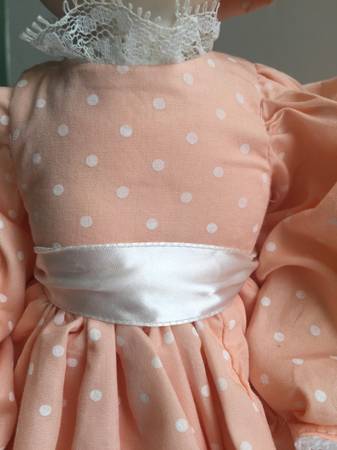 Her ruffled peach and white polka dotted hat is embellished with ribbon, bow and faux pearls. Her dress has a white ribbon detail around the waist. The long sleeves are edged in lace as is the dress and has a Southern Belle Flair.