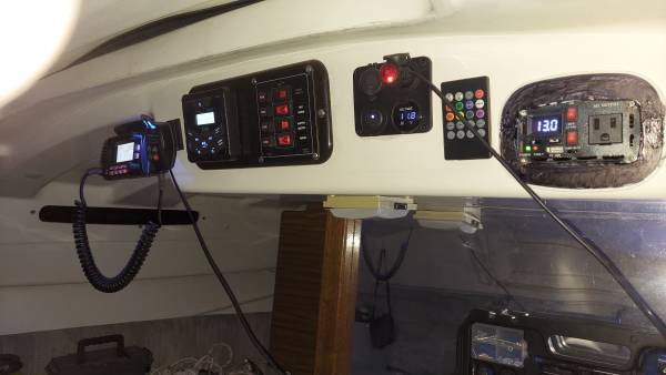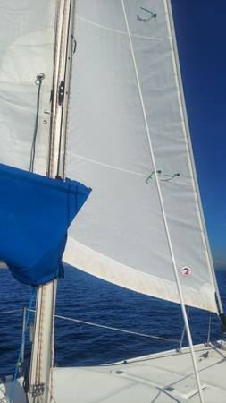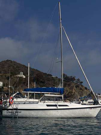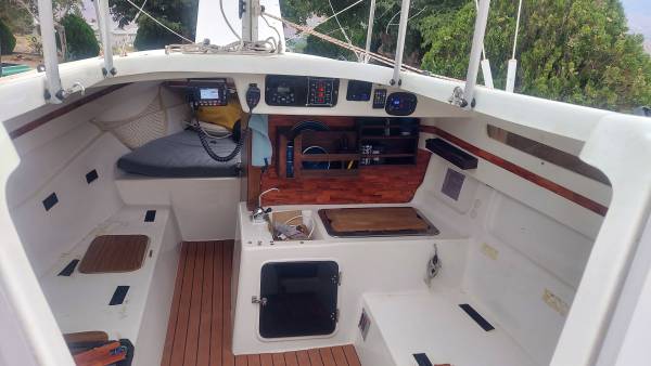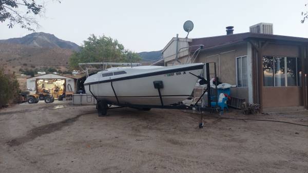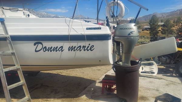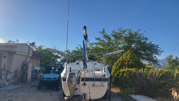 This boat is the cleanest and nicest example. That probably exists on the West Coast. It has brand new loose fitted, main sale brand new CDI furling jib new oversized head, stay new, adjustable back, stay anchor roller. All halliards led aft brand new blue water yachts, stack pack lazy jacks. Ruddercraft rudder. New tiller handle with tiller tamer. 9.9 Honda electric start outboard with separate starting battery runs like a dream. Additional double 100 W solar panels, with 100 amp hour lithium polymer battery 115 power inverter. New boss, AM FMC D Bluetooth Weather Channel radio with absolutely spectacular cabin mounted box speakers. New horizons VHF radio. Interior lighting interior fan. 30 amp solar controller with USB ports 5 gallons freshwater storage with new pump faucet. 6 gallon main fuel tank with 3 gallon spare. Recovered, seti cushions. Original v birth and rear birth cushions in great shape. Original cock pit cushions in great shape both trailer wheels have new bearings. Recently, packed with fresh grease and tires, with less than 500 miles. Once again, this is a excellent boat. I have outgrown it and am. Moving up to a bigger boat. It is a swing Keel design with a water ballast tank. There is absolutely nothing wrong with this boat. It is in perfect shape. I am willing to negotiate price, especially if some of the solar panels stereo radio and extras are not needed. I will remove them.