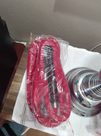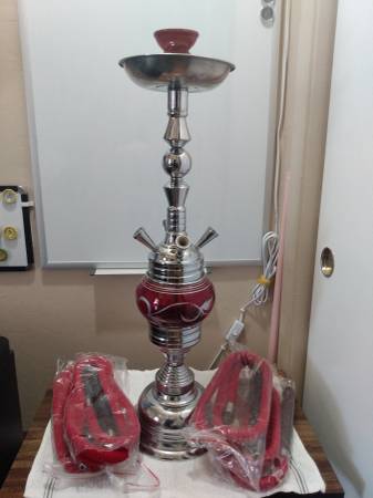 New hookah, 27'' tall. Never used. Hoses still wrapped in original packaging. Can be used as an ornate design piece in your home.