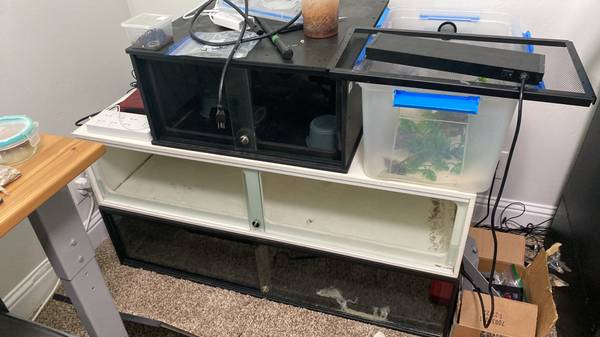 Animal plastics fully loaded with pro products heat panels, plumbed for misting system, built in led lighting, comes with cage locks, and heat bulbs in two 12 inch tall enclosures but I have spare pro products panels available if you’d like to swap.