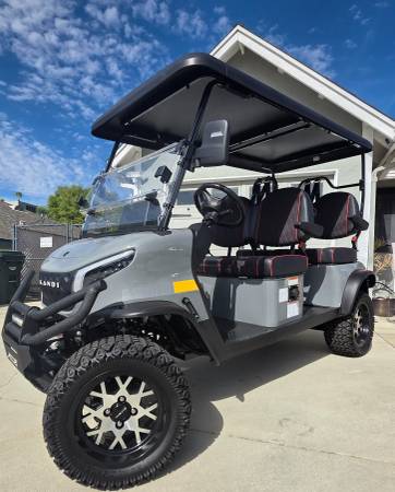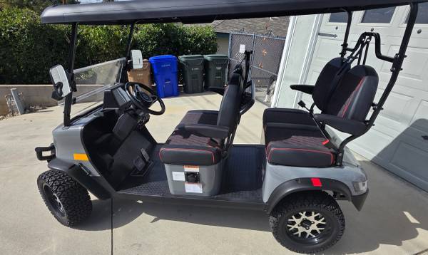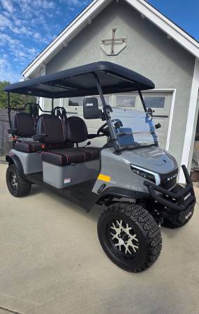Cement Grey. Lifted. Full front bumper with winch plate and dual stage light bar. Long range 150ah Lithium battery. Speed controller. Cart does 30mph. Reverse camera. Digital dash display. Front ice chest. Rear trunk. Street legal set up. LSV cart with mso paperwork. Priced to sell. Best riding cart around.