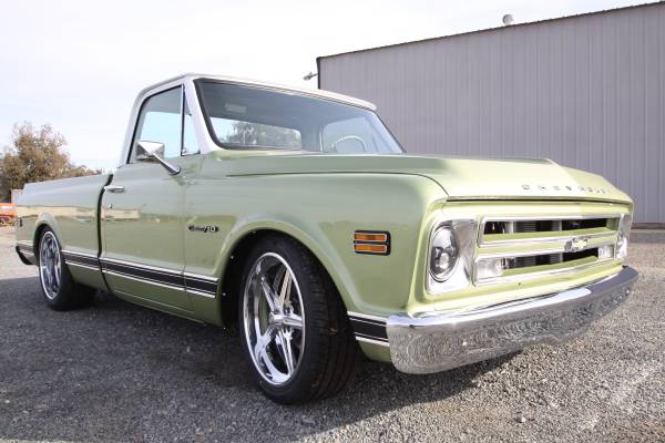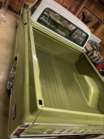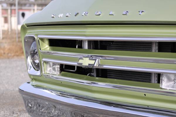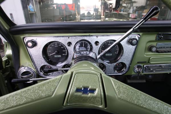 Factory 1972 c10 pickup, this truck is a California rust free original short bed, big window AC truck, we love the look of the 1968 c10 so we put a 68 front clip on the truck, Motor is a LS 5.3 with a BTR Stage 3 Cam, Aluminum after market Intake, CVF Billet Pulley System with AC- power steering pump, we kept all the original A/C boxes for the original look, custom Valve covers, chrome tilt wheel, factory chevy steering wheel, new aluminum radiator, dual fan set up, all new heater hoses, new braded stainless steel lines with polished aluminum AN fittings for A/C and power steering and Hydra boost lines, knock sensor delete plate, stock throttle body and injectors, War Performance wiring and ECM, New 4L60e Transmission with a 2700 stall convertor, Motor and transmission color matched to the color of the truck, Powder coated wheel wells, core support, All New 2 1/2" polished Stainless steel Coffin Exhaust system, New stainless steel Headers with v-band set up, New CCP Wilwood Hydra boost and master cylinder, all new brakes, all new ujoints in driveline, Body and paint has been completely redone and painted with the Factory Medium Olive Green on the body and interior and White on the top, all PPG base coat clear coat paint. Interior is all new with new carpets, new door panels with 1959 Impala inserts, seat reupholstered with original 1959 Impala inserts, all new door rubbers, Dakota digital dash and gauges, new door and window handles, new windshield and rubbers, all new chrome bumpers, Grill, new side trim. brand new 20" intro wheels 20x8 in the front 20x10.5 in the rear, New tires, new panhard bar. the whole frame has been painted and c-notched in the rear, new marker lights and led headlights, new shocks all around runs and drives like a new truck!