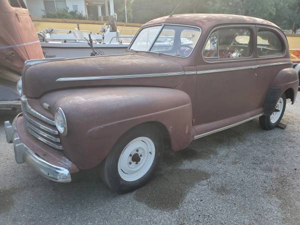 1946 ford tudor. Original flathead v8 with 3 speed on the column. Positive ground 6 volt system. Runs and drives. New brakes all around. New fuel sustem including tank. New water pumps, hoses and belts. New bias ply tires and tubes on original wheels. Very original car, sat from late 70s until a couple years ago when i pulled it from a shed. Will lower the price if you dont want the bias plys or original v8. 5500obo. May trade for classic car/truck or a harley.