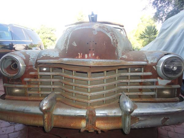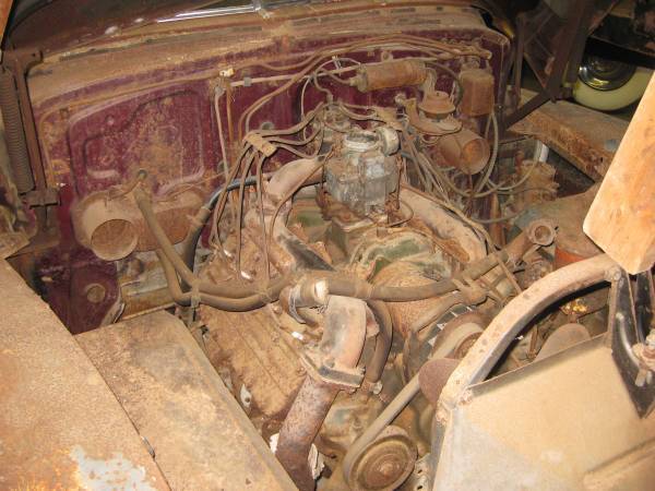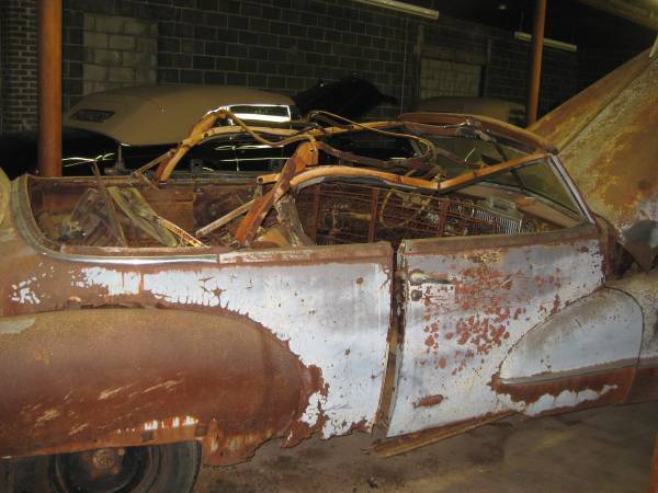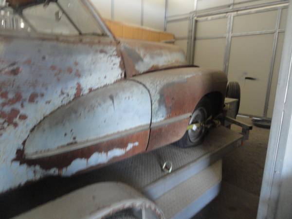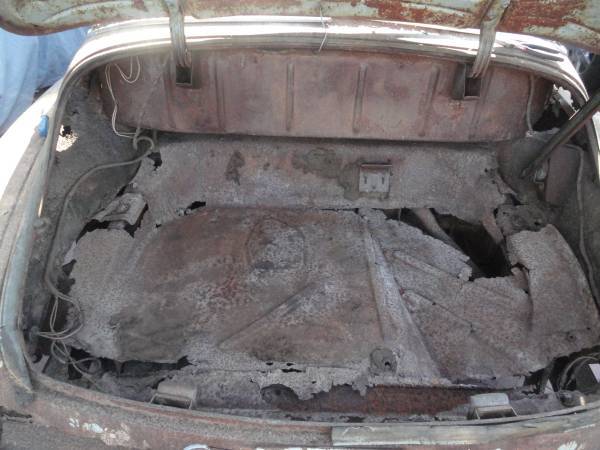 The cowl, trunk lid, hood, bumpers, drivetrain, motor/trans, and convertible rack are good parts. Some stainless steel is on the car. It rolls, and the tires hold air.