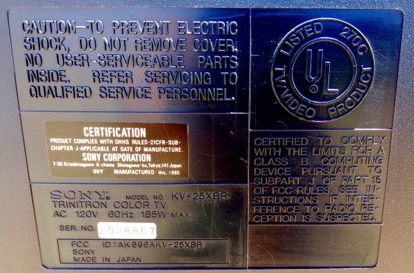 This sample was made in Japan and is one of the very first runs of the black model. Later production units came out of Mexico and they weren't as good. The picture is just superb. The set looks as good as a 30-year old TV can look, she's clean and there are almost no cosmetic defects at all - as beautiful as she can be.