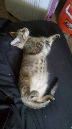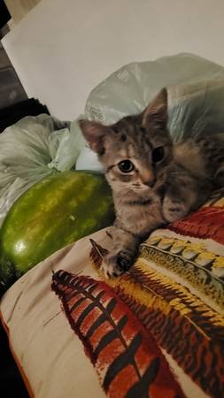 Rehoming Female Gray Tabby Kitten with orange specs in her coat For $20. Her name is Josie. She's 6 months old, isn't fixed, and doesn't have her shots.