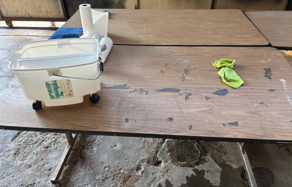 8) utility 6 ft. press wood tables, these tables sell from 89.99 to 400.00 new asking 20 each