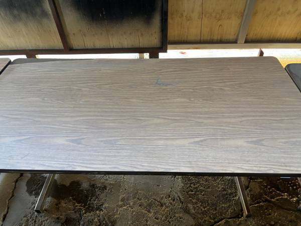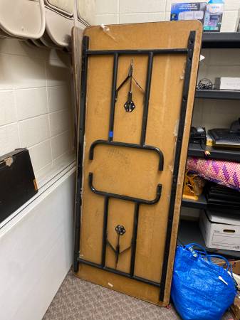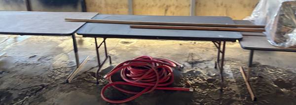 8 ) 6 ft. metal frame with press wood table tops , these are the very heavy ones, will be good for parties, dinners, yard sales, swap meets, large functions, sales booths, all are in fair condition, they are a bit dirty from being stored but overall good condition, sturdy, good for outside or inside, large get togethers, very versatile , these are a little old but very solid, need a little soap and water, swap meets, wedding's , social gatherings, church , fire booth stands, parks, very heavy and sturdy