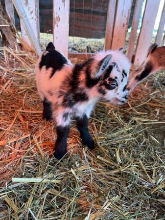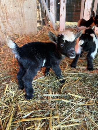 We have this black/white Nigerian dwarf buckling with blue eyes we’re asking $150. We also have the black with white head Doeling with blue eyes we’re asking $250. They were born on Saturday November 15th and will be ready for his new home as a bottle baby on Tuesday November 18th