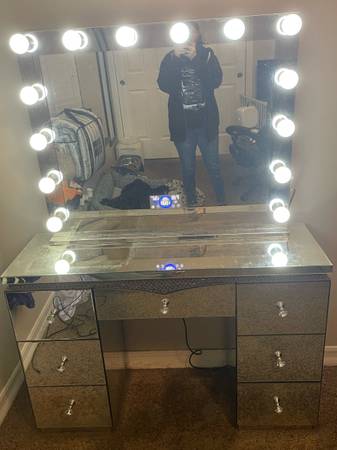 desk and mirrior included all glass. led light bulbs you can replace and has a Bluetooth speaker on the side of it , can set the date and weather ,etc .(as seen in photo) . comes with 6 square drawer and 1 long middle drawer (as seen in photos) perfect condition . got it for $1,500 from Furniture City . PICK UP ONLY