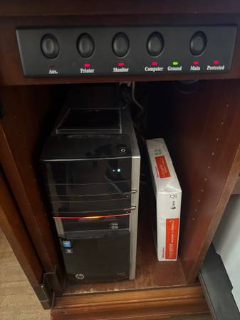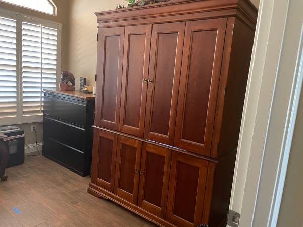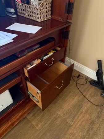 Bookcase Console Desk by Hooker Furniture. 58” wide x 25” depth x 78” high Pull out writing desk and pull out keyboard tray. File drawer and room for CPU and printer on pull out tray. Power source.