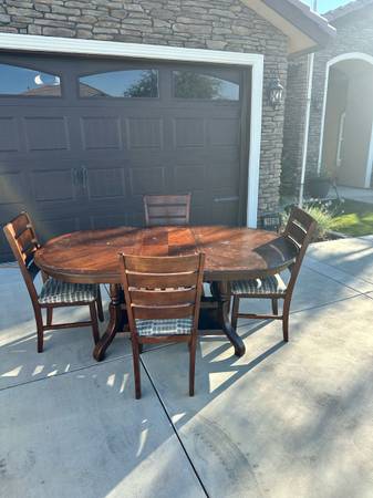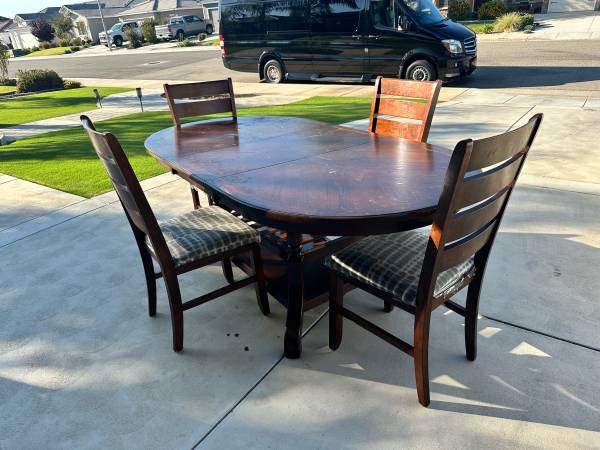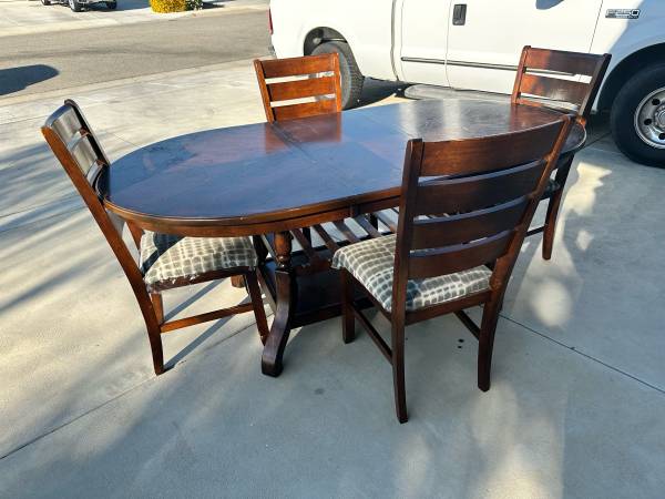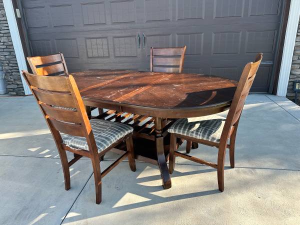 Nice Dining room set comes with 4 chairs a bench (not pictured) & also the removable leaf Seats 8 total with the leaf in place Could use a good wipe down and also the seat cushions could be...