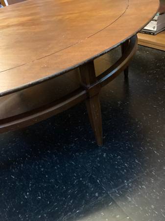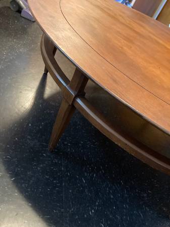 Sturdy mid-century coffee table - low to ground but not small: 48" diameter. Great condition, refinished top. $125 cash only, no $100 bills, no change.