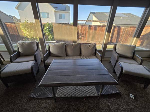 Hi, we are moving out and selling some of our furniture, we have an electric fireplace, a dining table with 6 sturdy chairs, a complete outdoor patio set and a sectional suede couch all for sale. We are looking to sell it all as a bundle so you can save. Asking $2200 obo for it all! Every piece of furniture you see in the pictures have been well maintained and taken care of and are fairly new. Please call or text me @ (nine two eight) 605-five four89 - Nate.