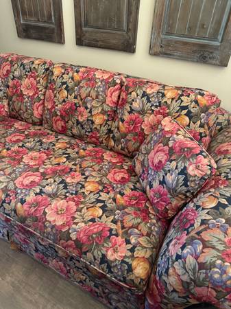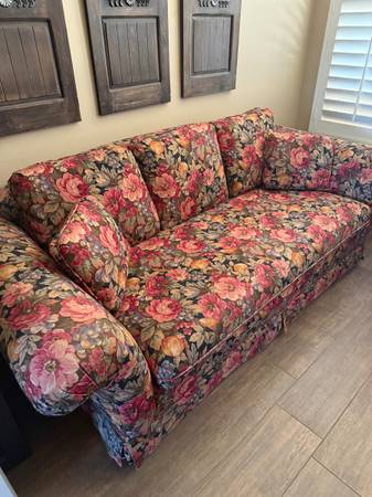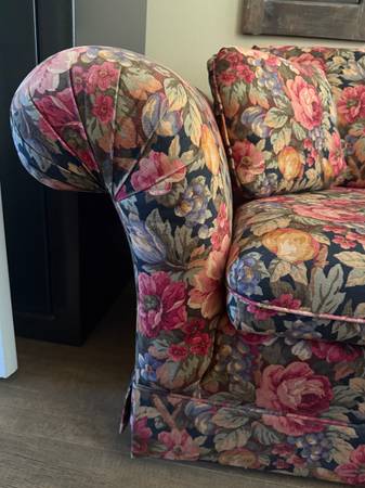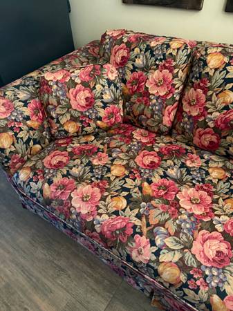 Sofa, floral print, great quality, rolled arms, single bench, burgundy, olive green and black floral. $150