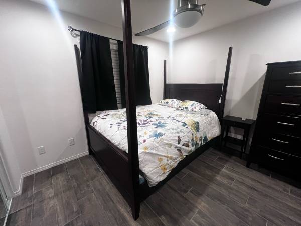 Solid pine wood 4-poster bed frame, size queen. Purchased from Bassett Furniture in Texas. In relatively good shape, has minor wear on the stain that can be touched up. Will likely require a pick-up truck to move the headboard. $50, purchased for ~$1500 ten years ago.