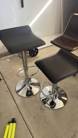 Two bar top seats, adjustable, pictured at both highest and lowest positions. Black vinyl with chrome, very gently used.