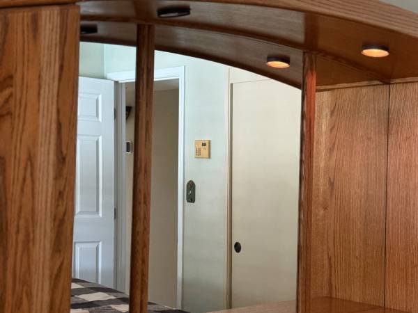 3 piece solid oak with mirror and built in shelving with doos attached to head board underneath lighting with mirror excellent condition