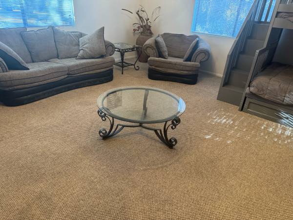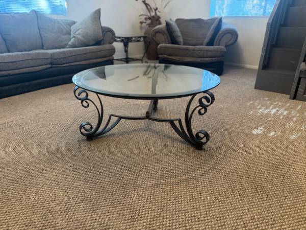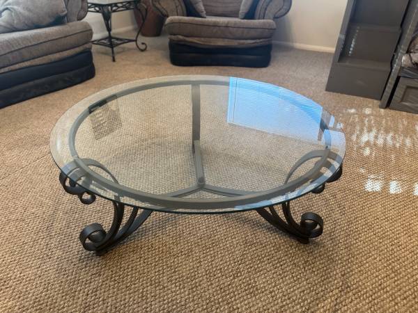 Wrought Iron Coffee Table With an Oval Glass Top Measurements: 38 inch diameter 16 inch Hight