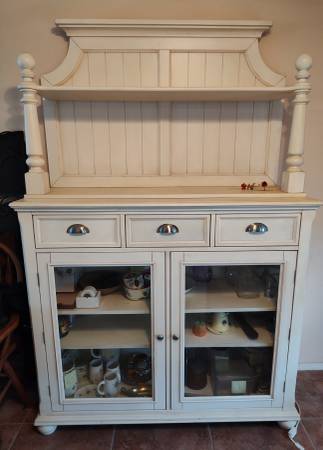 Beautiful vintage white 2 piece hutch and display cabinet. Upper part with one fixed shelf and a solid base that sits on the lower storage/display section where items are visible through two clear glass doors that open to 2 adjustable shelves. Entire unit as pictured measures 80" tall, 18" deep, 53" wide. (Shelf items pictured not included). $280 obo.
