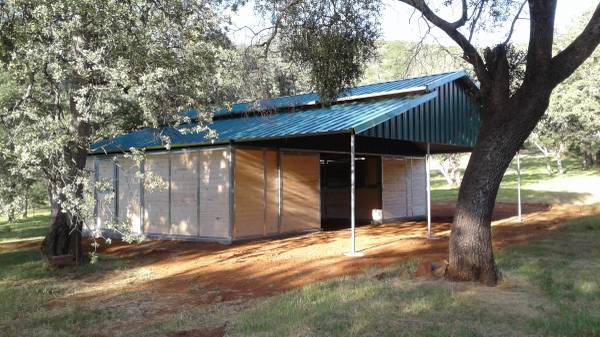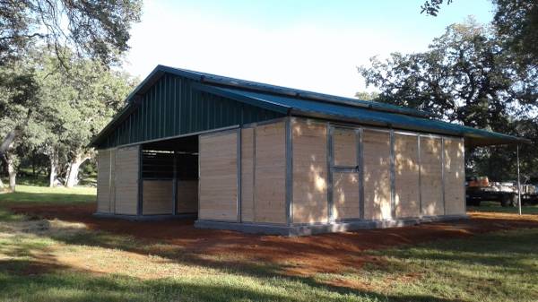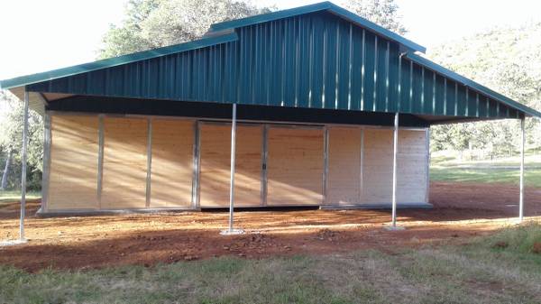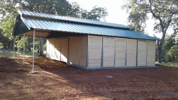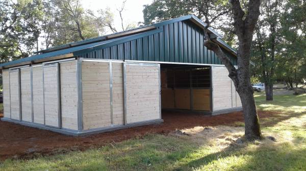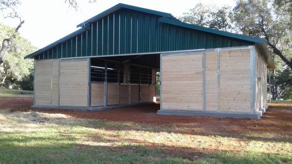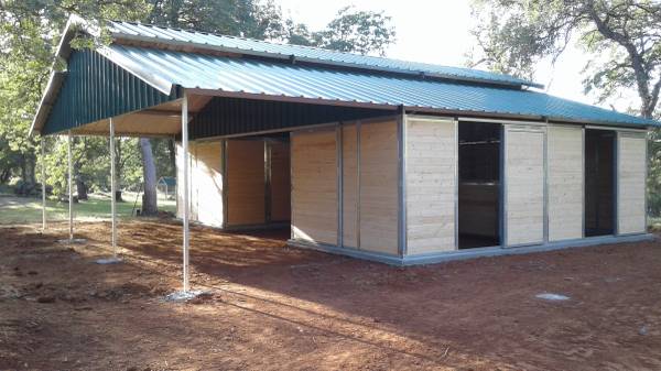 4 12x12 stalls 12 x 36 porch Concrete footings 2 x 2 galvanized steel frame 2 x 6 tongue and groove wood siding 26 gauge color metal roof Front and back doors Delivered and installed on your flat...