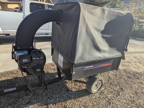 Ready to save yourself hours of yard work? This Craftsman towable lawn vacuum picks up leaves and twigs with a large hose. The 6.5hp Briggs & Stratton motor powerfully shreds everything into small mulch, which feeds into the trailer covered by a large canopy. It can be towed behind a quad or side by side, and the trailer dumps, but since it holds a large amount of material, it doesn't need to be emptied often. All hoses are in good condition and everything is ready to use!