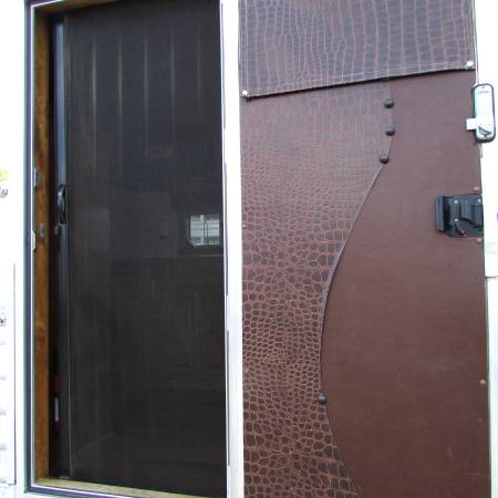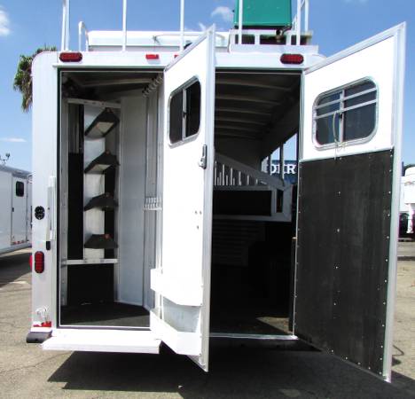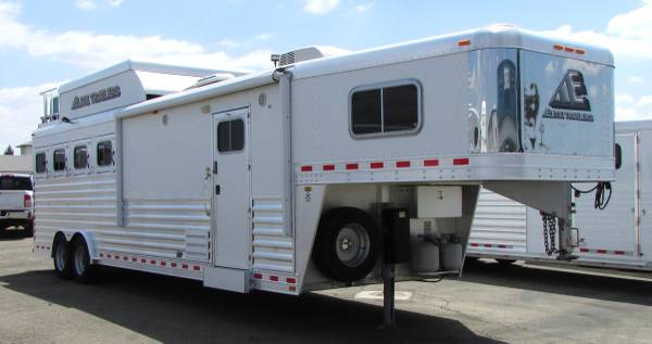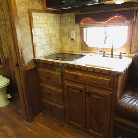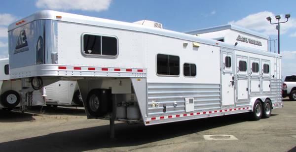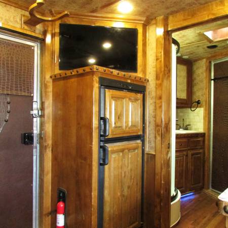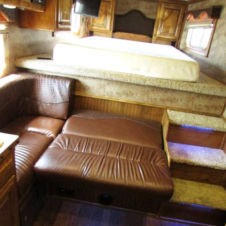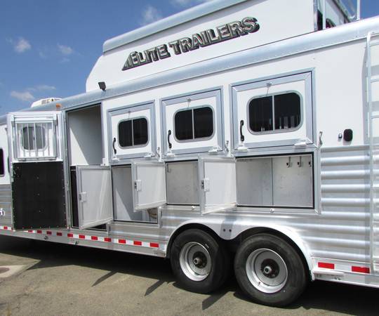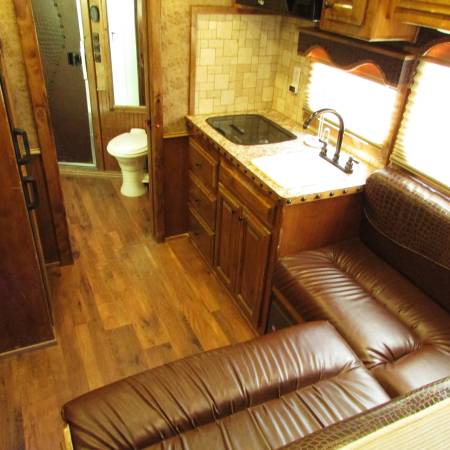 2017 Elite all aluminum living quarters. 8 wide, 7'6 tall with 12' short wall and a really neat interior configuration by West Texas Conversions. Dual 8,000 lb axles with an empty weight of 7850. Hydraulic jack, dual propane tanks, exterior water spigot, power awning, Onan quiet generator with 173 hours and recently serviced. Werm flooring, Hay pod with landing, polished stainless steel nose plate, spare tire. Everything works great. Fold down windows on tail side with fold down and safety bars on head side. Front stall escape door with corner feed bag. Padded jail bar dividers with 1st stall stud divider. Rubber wall mats on 3 sides, slam latch dividers, 2 way roof vents in each stall. Interior lights, tie hooks, pass through door to LQ. Rear tack with over 20 bridle hooks, 4 tier padded saddle racks, brush box on door, interior light, sliding window and combo lock as well as key lock. Exterior flood lights, tie hooks and rubber dock bumper at rear door with fold up steps on tack room and LQ. Exterior manage storage with J hooks, generator fuel tank and large access door. Interior living quarters is top of the line with exterior speakers, outlets, water heater and Fridge access doors. Exterior porch light, grab handle. Beautiful warm toned wood colored interior with dark chocolate leather trimmed with Crocodile pattern. Cute L shaped loveseat with fold up table and jackknife sofa. Interior speakers, recessed LED lighting, fire extinguisher, co and smoke alarms. Every window has day/night shades with matching croc pattern trim valance and LED under lights of cabinets, windows, steps. Brushed copper fixtures in sinks and shower. Lots of storage with heavy duty hinged cabinets. 2 TV's, 1 with fold out arm above bed. 8 cubic inch fridge with separate freezer and matching wood panels. Ducted AC/heat, roll up screen door on entrance, lights and generator controls easily located on entrance wall. Over door wood hat racks, full pull out bathroom pocket door, Stone patterned back splash in kitchen/bath. Microwave/convection oven over 2 burner cook top with exhaust fan. Stereo, carpeted bedding area, in bed recessed lighting with storage at the nose. Large bathroom with hanging wardrobe, laundry hamper, sink with ample counter space. Large corner shower with privacy light, sky light, roll out doors. Bathroom exhaust fan, double wide medicine cabinet, towel rack, full size mirror. Pass through door with lock, Fantastic remote control exhaust fan. Exterior double battery box with power override switch.