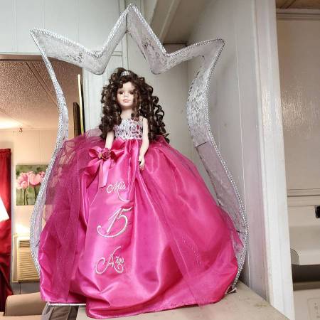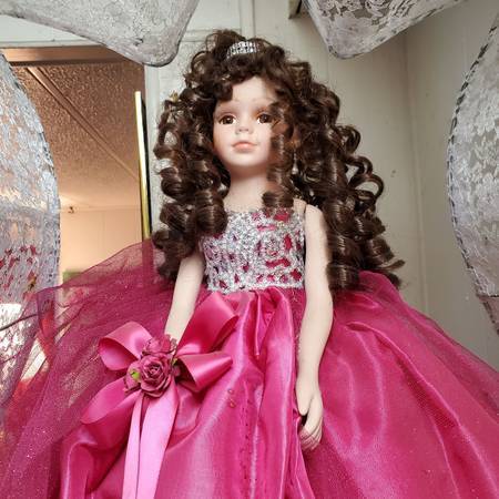 Excellent condition large Porcelain, ceramic large doll. 15 Años, Quinceanera. Dress has some spots, dusty, see pics. Silver Frame arch included. Call 719 two three one 1278. Price is firm. Cash only. No texts or emails, must call first and leave a message.