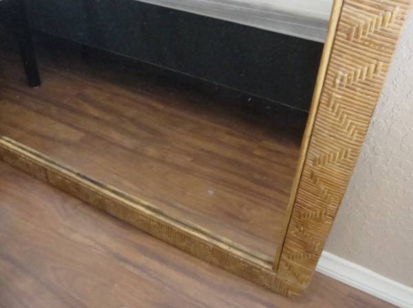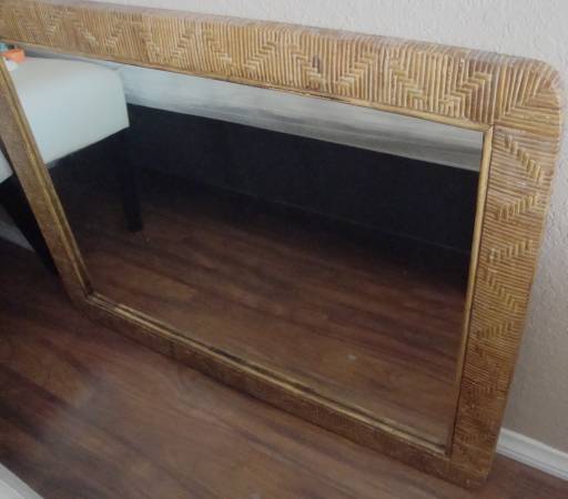 High quality heavy duty decorative mirror with a natural-color wicker rattan frame. Already wired for hanging with a hook. Retail price over $200.00. Excellent condition and suitable for all rooms...