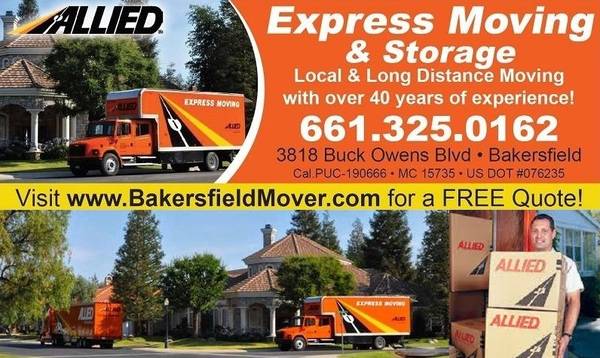 We are EXPRESS MOVING & STORAGE a Licensed mover in Bakersfield, located at 3818 Buck Owens Blvd. We can Move Homes or Apartments and Senior relocation's in Bakersfield Call us for a Free Phone Quote at 661-325-0162.