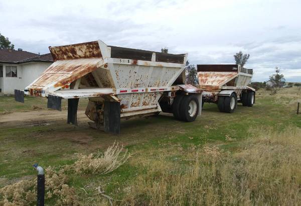 1986 double dump trailers. 90% rubber on tires, good brakes, s-cams and bushings all good, new hitch on pull trailer, have new fender for left side to match right, trailers are ready to work....