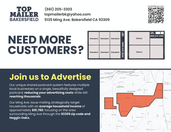 We are excited to introduce a profitable opportunity for motivated individuals to join the TOP MAILER BAKERSFIELD Sales Team! We specialize in shared postcard mailings that deliver powerful, affordable advertising directly to thousands of local homes and businesses across Bakersfield. This is your chance to be a part of one of the most effective marketing tools for small to medium-sized businesses in our area.