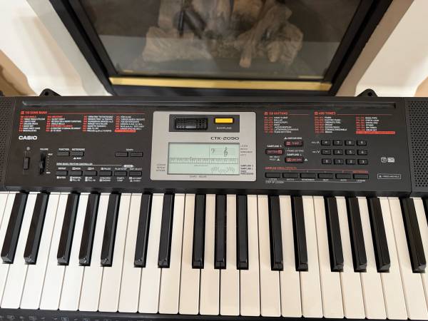 The Casio CTK-2090 is a 61-key portable digital keyboard designed for beginners and casual players, featuring a variety of built-in tones, rhythms, and a sampling function. It includes a built-in microphone for sampling sounds, an easy-to-read LCD display, and lesson modes to aid learning.