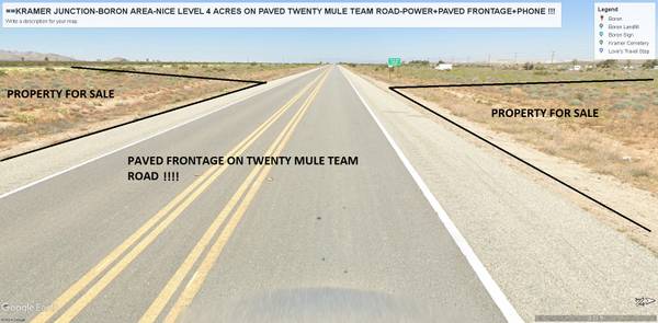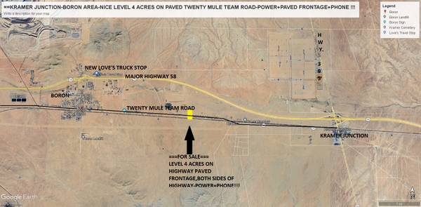 **Kramer Junction- Boron **NICE LEVEL 4 ACRES ON BOTH SIDE'S OF MAIN HIGHWAY-TWENTY MULE TEAM ROAD !! **Property Located just half Mile from Major Highway 58 !!! **Ideal Trucking Hub , with Custom...
