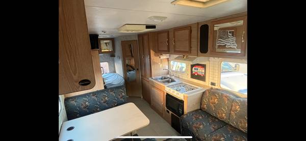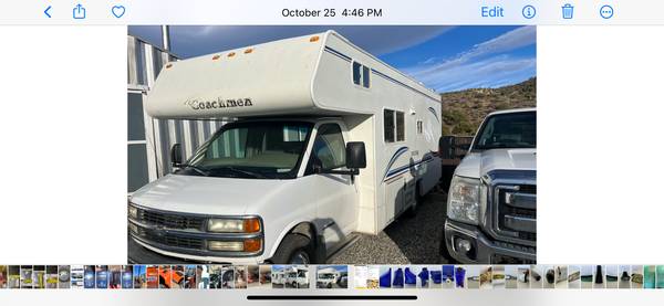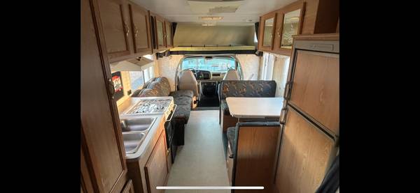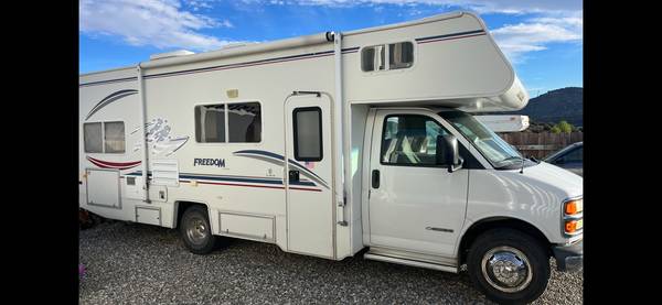 2002 coachman freedom 25 ft class c motor home for sale. Chevy 3500 chassis with 5.7 v8 gas engine with only 48k miles. Has rear bed, overcab bed, couch which converts to bed and dinnette also makes a bed so it can sleep up to 8 people. Built in onan 2800 watt generator with only 103 hours on it. All systems functioning properly as well as a new diesel heater. Some of the graphics are faded and the cab ac isn’t cold but we always just ran the generator and rooftop unit when necessary. Roof recently resealed for maintenance, no leaks and never any water damage. $15000 OBO