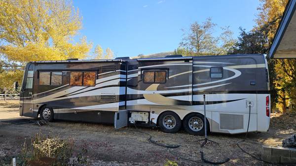 For sale: 2008 Monarch Holiday Rambler coach, 42 feet long, four slide outs, 400 Cummings diesel engine with 91,457 miles, Allison 6 speed transmission. Onan Quiet Diesel 10k generator with 570.5 hours. Full bath in rear and a half bath in the middle. Sleep number king mattress. Washer and dryer.