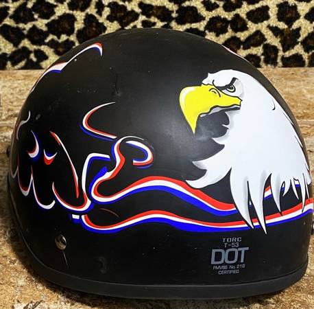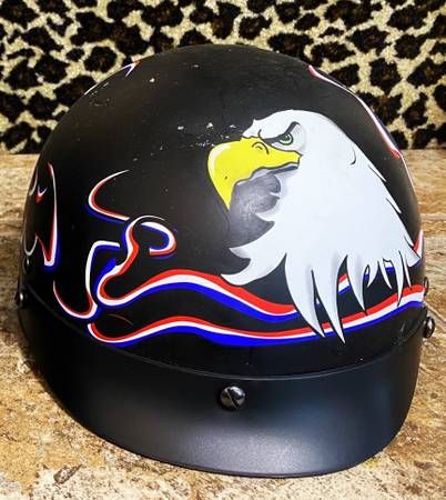 flat black , Cruiser Patriotic Eagle Graphics Motorcycle Half Helmet, needs a trim reglued not ripped off just come lose in one spot nothing wrong with helmet nice helmet, great as a extra rider or even bicycle,