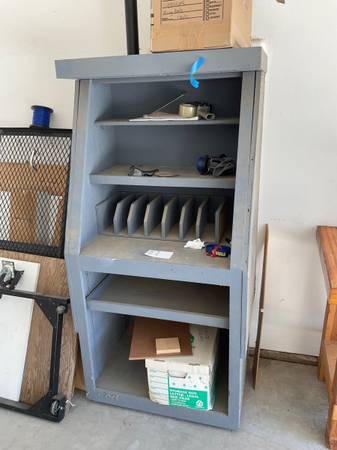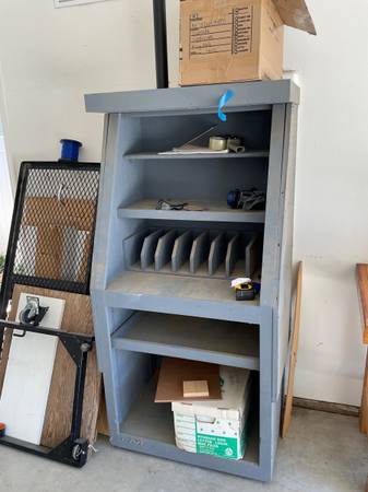 Rolling tool cabinet used for drills, air staples and nailers, fasteners glues etc. $50