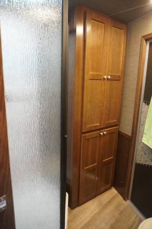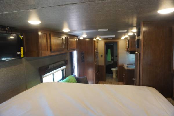 Great 15’ Layout with the Dinette in the Slide and a Sleeper Sofa. The Bunk Area features a mattress, TV and Storage. The Living Area Features: A Fridge, Furnace, Duct AC, 10 Gallon Water Heater, Single Sink, 2 Burner Recessed Cook Top, Convection/ Microwave Oven, and Fridge. The Bathroom has Sink, Shower, Toilet, Medicine Cabinet, Wardrobe Closet and Walk thru door.