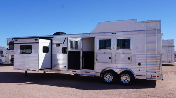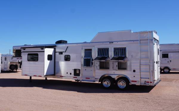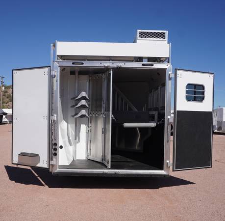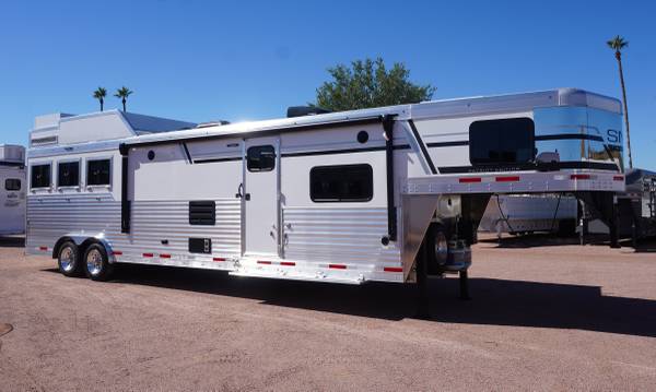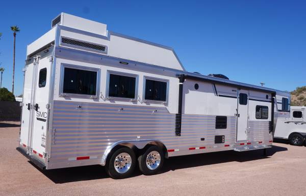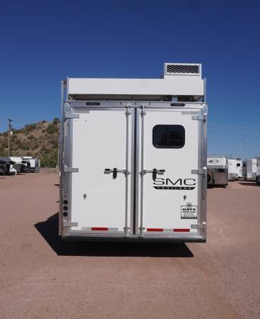 2026 SMC 15’ SW 3 Horse Living Quarter! This Trailer is 8’ Wide, 7’6” Tall and has Drop Down Windows on the Head and Tail Side. The Trailer Features: Hydraulic Jacks, Dual Propane, Dual Batteries, 4.0 Gas Generator, Solar Panel, Escape Door, Mangers, Hay Rack, Ramp, Electric Awning w/ LED Light Strip, 90” Flip Down Step.