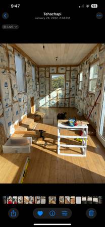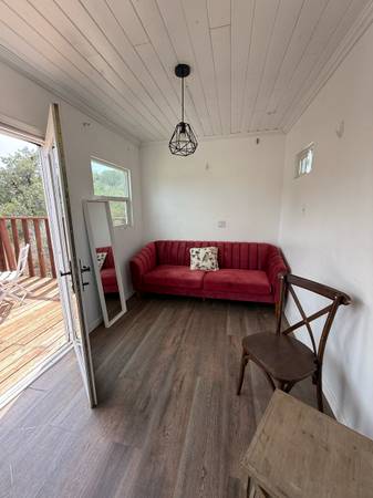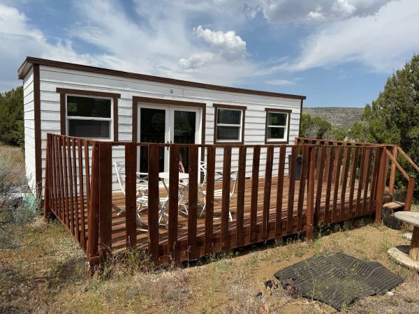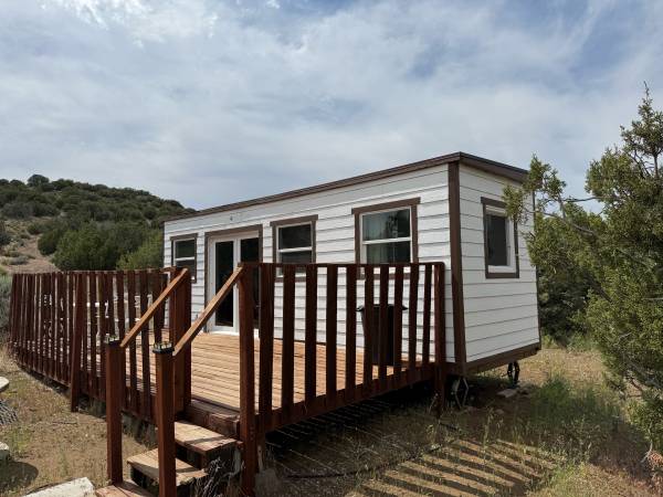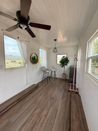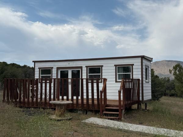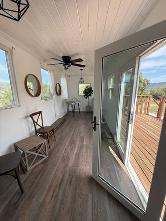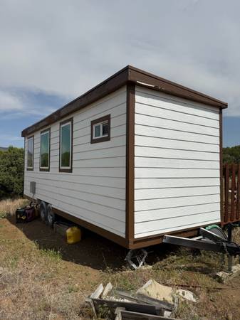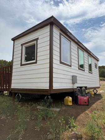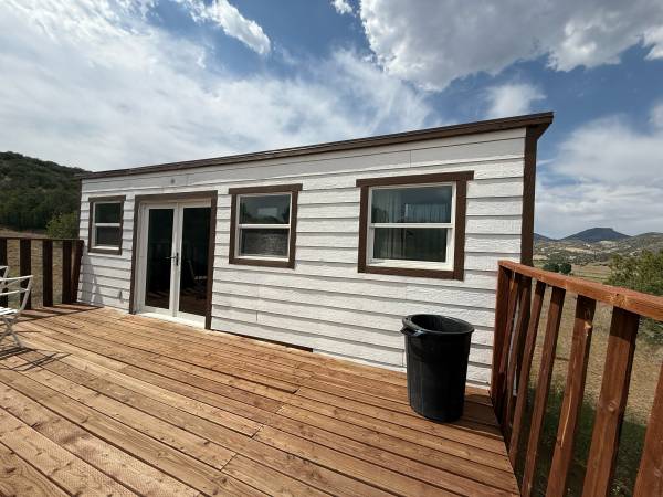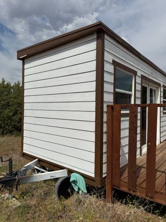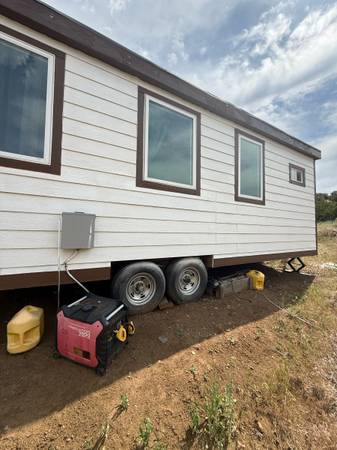 9 feet wide by 27 feet long trailer with a two inch ball tongue. It’s a metal trailer with a wood frame insulated it has electricity and breaker box lights and switches. No plumbing but it can easily be installed. Great condition. The trailer was already built when I bought it, and all I did was add sheet rock and paint. It has four jack stands attached to the bottom to level it. Two tires on each side. Lots of windows and a French door entry. The deck in the pictures is not attached and it can be easily removed for transportation. The deck is not included the price is for the trailer only. There is no land included either the price is for the trailer only. If you have any questions please call or text (310) 597-five 8 five 1